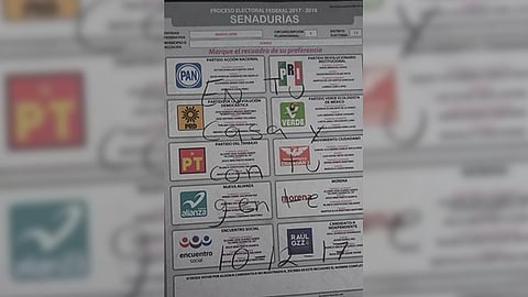 En redes sociales se hizo viral una fotografía en la que un ciudadano presumía su boleta electoral para elegir al candidato a Senadurías Federales con el mensaje "en tu casa y con tu gente", seguido de la fecha "10-12-17".