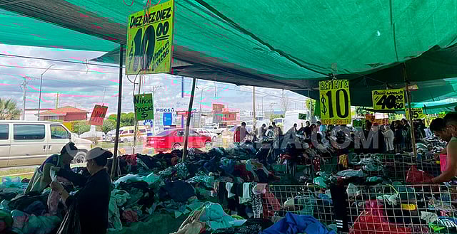 Desde las 7 de la mañana, los miércoles, sábados y domingos, los pasillos se llenan de vida bajo lonas verdes y amarillas. Ahí puedes encontrar ropa desde tan solo 10 pesos la prenda: blusas, pantalones, shorts y hasta vestidos.