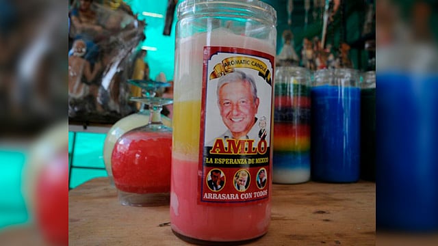 En un mercado de Tabasco, lugar de origen del candidato a la presidencia de la república, se encuentran a la venta veladoras con la imagen del representante de la coalición "Juntos Haremos Historia".