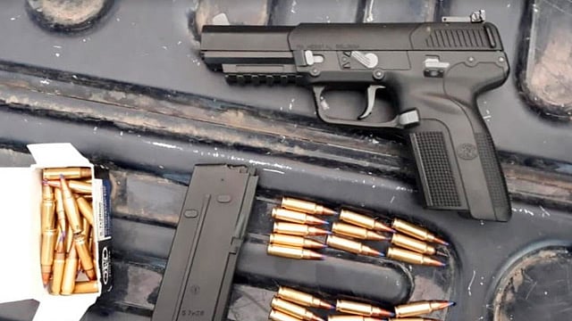 Elementos de la Policía Michoacán y de la GN realizaban labores operativas en la demarcación, cuando en un predio localizaron el arma de fuego calibre 5.7, así como los cartuchos útiles.