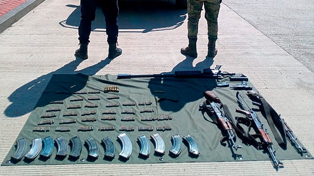 Derivado de la implementación de acciones operativas en el tramo carretero Coahuayana-Aquila, oficiales de la SSP en coordinación con personal del Ejército Mexicano, efectuaron la localización de cuatro fusiles, una pistola, 346 cartuchos útiles de diferentes calibres y 13 cargadores.
