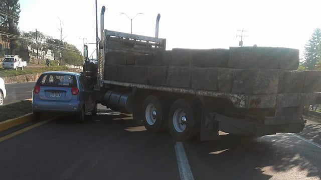 Morelia, Michoacán (MiMorelia.com).- Un auto compacto y camión que transportaba bloques de cantera protagonizaron un choque sobre la carretera Morelia-Quiroga, percance ocurrido cerca de las 08:20 horas de este viernes.