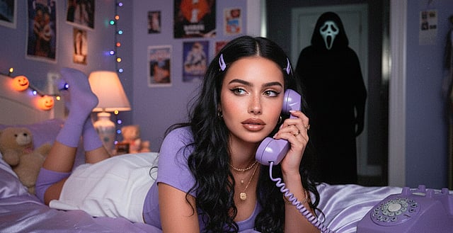Con esta foto mía y sin cambiar las caracteristicas del rostro, crea un retrato de ensueño estilo Y2K de mi acostada sobre una brillante ropa de cama de satin lila mientras sostengo un gran teléfono con cable estilo años 90 color lila y en una pose pensativa de ensueño, su largo cabello negro cae libremente en rizos sueltos en tono con clips lilas en cada lado. Tengo puesta una blusa color lila de manga corta, falda blanca tableada corta y calcetas lilas, recostada boca abajo. Uso joyas delicadas que incluyen delicados collares y accesorios de oro y anillos gruesos de oro. La habitación detrás de mí es femenina y de ensueño con carteles de estilo años 90, con peluches de ositos. Su maquillaje es simple pero glamoroso con brillo de labios marrón y delineador de labios marrón y su delineado negro perfectamente delgado. La foto debe tener un estilo granulado de los años 90 con una fuente de luz como una lámpara en una habitación con poca luz por la noche. El asesino de Ghostface debería estar detrás de mí, mirándome, su cuerpo debería estar tenuemente iluminado y debería estar parado en la puerta de un pasillo con poca luz. El fondo detrás de él debería ser ligeramente oscuro y siniestro. La foto es tomada de noche y solo alumbra un lamparita de noche y luces color tenue tipo navidad, con temática de Halloween