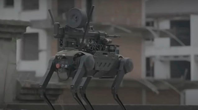 En las imágenes se observa a un dron sobrevolar un edificio, pero poco después desciende un perro robot con armas adheridas a su espalda que se levanta en sus cuatro patas y comienza a buscar objetivos alrededor.