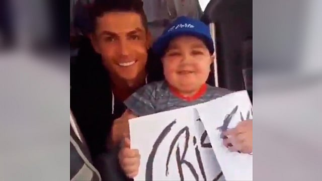 En las imágenes que se han hecho virales en redes sociales se ve al pequeño Eduardo, de 11 años y que padece leucemia que fue a la concentración de Portugal con un cartel que pedía un abrazo de CR7.