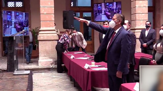 En el patio central del recinto legislativo, el ahora alcalde juró guardar y hacer guardar la Constitución Política de los Estados Unidos Mexicanos, la particular del estado y las leyes que ambas emanan, y, desempeñar leal y patrióticamente el cargo ya citado.