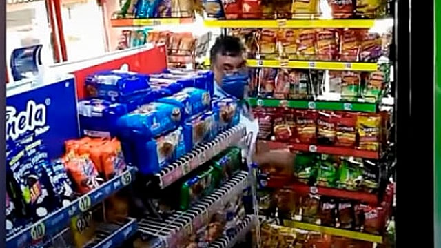 El hombre, que trabajaba como vendedor en el área metropolitana tercera sección en el Estado de México, aprovecha el descuido del dueño de la tienda para guardar bolsas de Sabritas debajo de su pantalón.