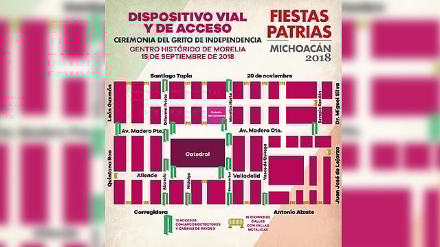 A partir del 14 de septiembre por la noche, iniciarán cortes viales y retiro de unidades vehiculares en las zonas de anillos de seguridad y puntos estratégicos para mantener la vigilancia en espacios como las plazas de Armas y Melchor Ocampo; en tanto que, en la madrugada del 15, se llevará a cabo la instalación de arcos detectores y vallas metálicas para trazar el diámetro de atención y vigilancia.
