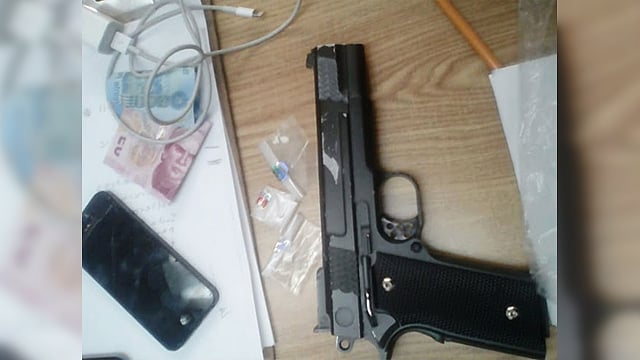 También se aseguró el vehículo en el que viajaban los sospechosos, marca Chevrolet, línea Sonic LT, color gris, y se decomisó un arma de fuego y tres envoltorios con metanfetamina; asimismo, se recuperó el celular robado.