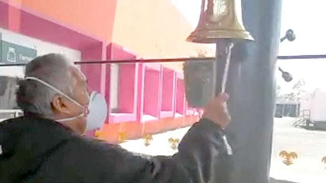 Ciudad Nezahualcóyotl, Estado de México (MiMorelia.com).- Los trabajadores del Centro de Convalecencia IMSS-CRIT de Ciudad Nezahualcóyotl, Estado de México, hicieron sonar la campanita tradicional para anunciar el último egreso de un paciente que venció al Covid-19. Al cruzar la puerta de salida, Don Juan Carlos escuchó palabras de aliento del personal médico que lo atendió: "usted es un triunfador y puede ahora decir que superó esta enfermedad".