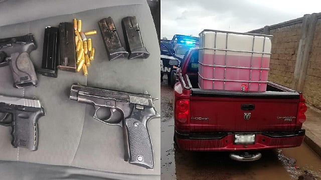 Morelia, Michoacán (MiMorelia.com).- Resultado de una acción operativa realizada por personal de la Secretaría de Seguridad Pública (SSP), se logró la detención de cuatro personas del sexo masculino en posesión de tres armas de fuego, cargadores y cartuchos útiles, así como un contenedor en el que transportaban aproximadamente 900 litros de combustible, aparentemente de procedencia ilícita.