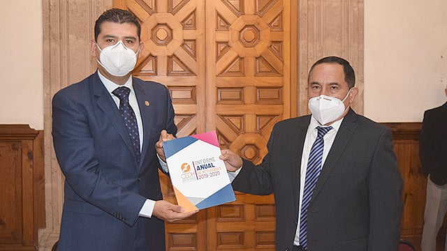 Morelia, Michoacán (MiMorelia.com).- El encargado del Despacho de la Presidencia, Uble Mejía Mora, hizo entrega del Informe de Actividades de la Comisión Estatal de los Derechos Humanos (CEDH) al presidente de la Mesa Directiva de la LXXIV Legislatura local, diputado Octavio Ocampo Córdova.