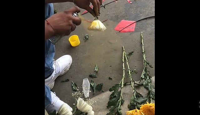 Fue en Twitter donde se viralizó el peculiar video, en el que el hombre pinta una a una las flores. Se puede observar que las pone en el suelo para luego juntarlas y posiblemente venderlas.