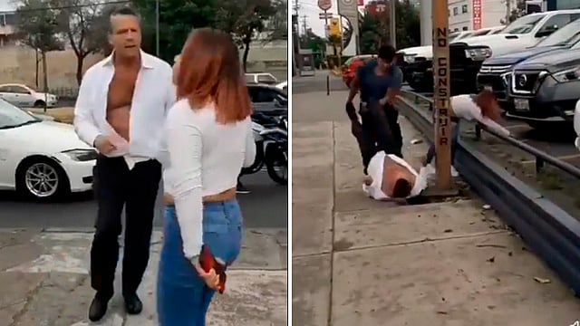 En un instante, la mujer le quita el celular a Adame y éste se lo pide molesto. El conflicto continúa con empujones hasta que la chica avienta el celular al suelo y en su intento de recuperarlo, el hombre toma a Adame por el cuello, forcejean y el actor termina en el suelo.