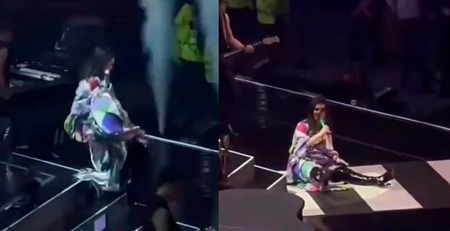 Cuanto cayó la artista interpretaba su tema “Zero”, en el escenario durante su presentación de World Winter Tour 2024, en Milán, Italia.