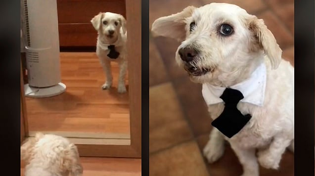 Morelia, Michoacán (MiMorelia.com).- Un perrito no ha dejado de verse al espejo desde que sus dueños le hicieron una corbatita, y la verdad es que ¡se ve encantador!