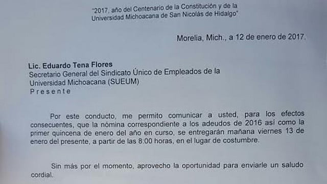 Morelia, Michoacán (MiMorelia.com.- En estricto cumplimiento al compromiso adquirido por el rector Medardo Serna González con los trabajadores académicos y administrativos de la Universidad Michoacana de San Nicolás de Hidalgo (UMSNH), este viernes 13 de enero quedará cubierto el pago pendiente de la última quincena de 2016, lo mismo que de la primera quincena de enero de 2017, en ambos casos con las correspondientes prestaciones.