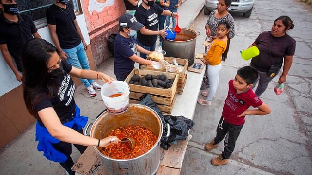 La entrega del pozole comenzó a las 14:00 horas, las familias acudieron con sus respectivos recipientes para recibir las porciones correspondiente a sus integrantes, aguacate y tostadas para acompañar "el calientito y delicioso pozole rojo vegetal".