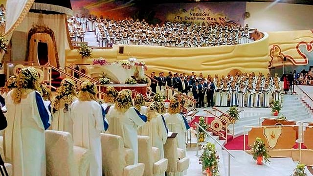 Reunidos en las instalaciones del templo de La Luz del Mundo, los feligreses oran por la pronta solución a las acusaciones en contra de Naasón Joaquín García, a quien se le acusa de tráfico de personas, producción de pornografía infantil, violación de un menor y otros delitos.