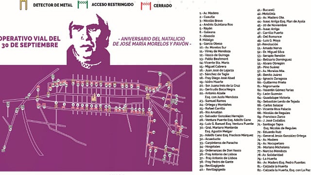 Se detalló que para el viernes 30 debido a las actividades del recorrido en Bando Solmene y el Acto Cívico para conmemorar el Aniversario del Natalicio del Siervo de la Nación, a partir de las 22:00 horas del jueves los cortes se extenderán desde Acueducto esquina con Carpinteros de Paracho, Avenida Madero a la altura de Avenida Pedregal, y al Norte en Santiago Tapia y 20 noviembre, en tanto en la parte Sur, en las calles Antonio Alzate y Corregidora.