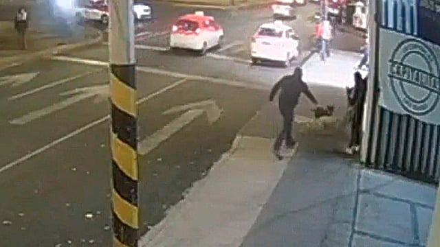 El saca una pistola de su chamarra y dispara una vez contra un perro, que queda tirado en la banqueta.