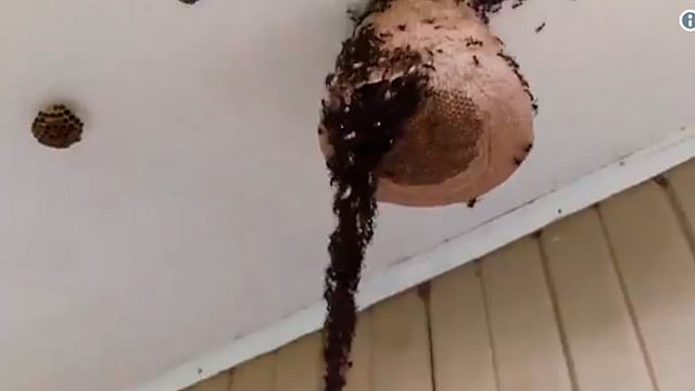 En las imágenes se puede ver cómo el puente comienza en una zona del techo, de ahí cuelga bastante y sube para llegar a la colmena, en tanto hay varios de estos insectos entrelazados mientras otros pasan por encima de ellos.