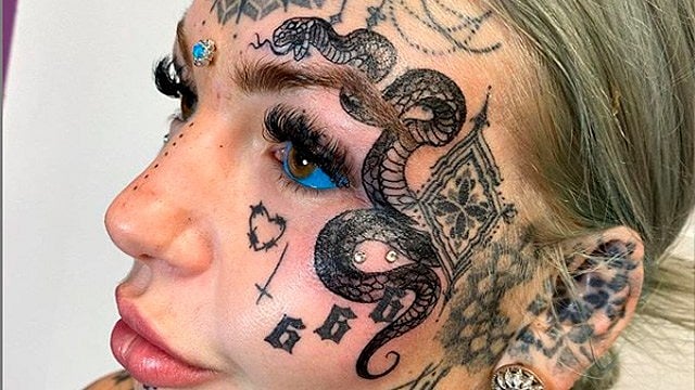 La joven cuenta con más de 200 tatuajes de pies a cabeza, se ha aumentado los senos, rellenado las mejillas, labios e implantes puntiagudos en orejas y corte en la lengua, en todo ello ha gastado 26 mil dólares.