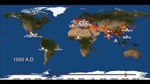 Los colocó en un mapa interactivo, donde se observa el crecimiento de las ciudades conforme transcurren los años y cómo ese vacío de los continentes se empieza a poblar. Así, las ciudades de Medio Oriente, la Dinastía China, el Imperio Romano, y en nuestro continente la civilización Maya, surgen como puntos en la geografía, A.C.