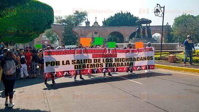 Morelia, Michoacán (MiMorelia.com).- Con la consigna de que se les permita abrir los establecimientos, aproximadamente 100 dueños de gimnasios se manifestaron en la ciudad de Morelia con una marcha pacífica desde la Fuente de las Tarascas rumbo a los palacios Municipal y del Gobierno para pedir que puedan reactivar dichas fuentes de trabajo, que se han visto afectadas por la crisis económica generada a la par de la pandemia del Covid-19.