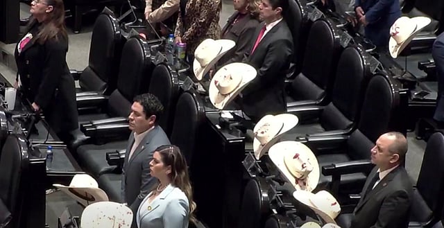 En el acto hubo un gesto simbólico desde varios curules: sombreros manchados de rojo colocados como señal de protesta y exigencia de justicia.