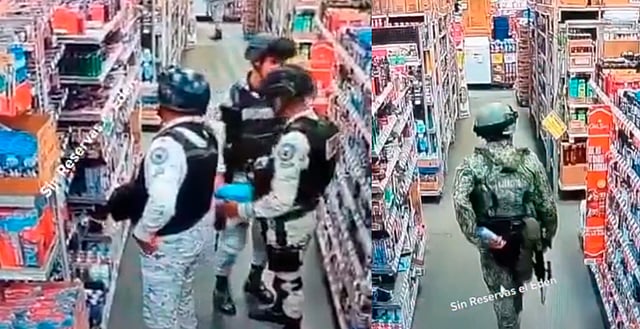 En otro video, grabado aparentemente en el mismo establecimiento, se ve a tres agentes de la Guardia Nacional, vestidos con camuflaje blanco, guardando productos en sus bolsillos mientras recorren los pasillos de la tienda.