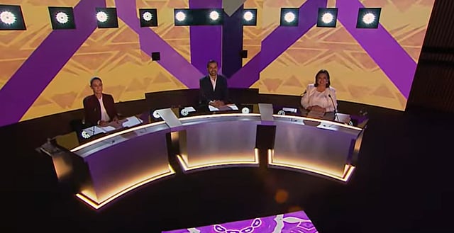 Los moderadores Denise Maerker y Manuel López San Martín dieron la bienvenida a los candidatos Claudia Sheinbaum Pardo, Xóchitl Gálvez Ruiz y a Jorge Álvarez Máynez.