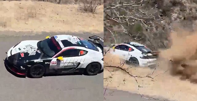Morelia, Michoacán (MiMorelia.com).- Un automóvil Porsche protagonizó un aparatoso accidente durante el Rally Durango Express 2026, luego de caer a un barranco en una curva del municipio de Mezquital.