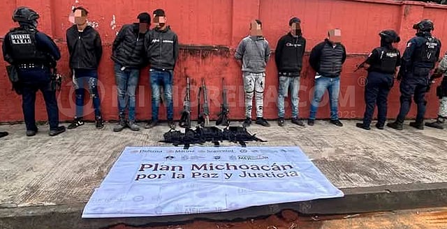 Trascendió que, durante un despliegue operativo realizado la mañana de este 15 de enero, fueron capturados Carlos Iván G. E., de 33 años; Miguel Ángel P. O., de 40 años; Jorge Alberto V. H., de 35 años, y Gerardo Antonio A. G., de 30 años de edad, originarios del estado de Jalisco; así como Hugo Daniel P. P., de 24 años, vecino de Uruapan, y Marvin L. R., también de 24 años, este último de nacionalidad venezolana.