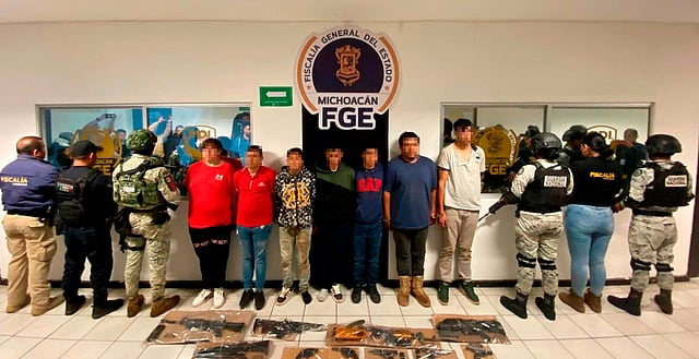 Huaniqueo, Michoacán (MiMorelia.com).- Personal de las secretarías de Seguridad Pública (SSP) y de la Defensa Nacional (Defensa), así como de la Fiscalía General del Estado (FGE) y Policías locales detuvieron a siete hombres, en posesión de 10 armas de fuego; también se les decomisaron dos vehículos en los que se transportaban, esto durante una acción operativa realizada en este municipio.
