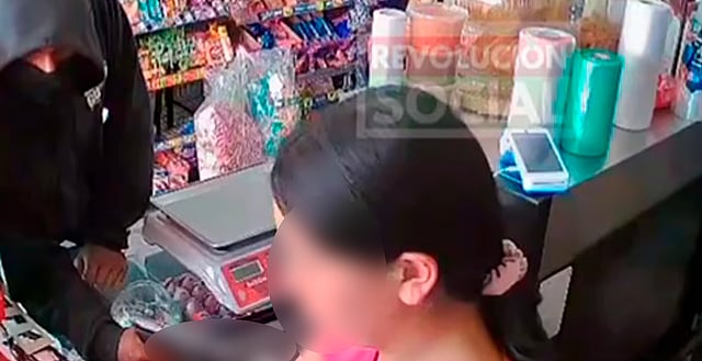 En el video se observa al hombre cubierto con una sudadera oscura y cubrebocas, mientras amenaza a la encargada del local con una arma de fuego.
