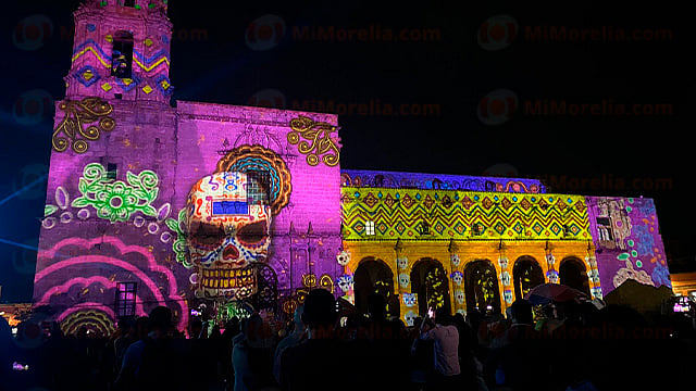 Morelia, Michoacán (MiMorelia.com).- La noche de este sábado regresó a la cantera rosa de la capital el videomapping, en esta ocasión alusivo a la celebración de Noche de Muertos.