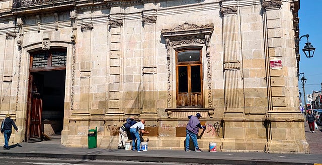 Morelia, Michoacán (MiMorelia.com).- La Gerencia del Centro Histórico de la ciudad de Morelia continúa con los trabajos de retiro de grafitis y pintas en la cantera de edificios emblemáticos ubicados sobre la avenida Madero Oriente, como el Palacio Federal y el edificio de Correos y Telégrafos de México.