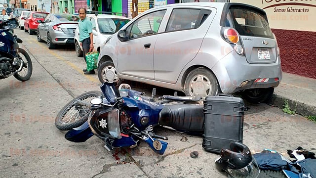 Morelia, Michoacán (MiMorelia.com/RED 113).- Un motopatrullero de la Policía Michoacán quedó herido al ser atropellado por un automóvil manejado por una señora, el cual a su vez se impactó contra otro carro que estaba estacionado, según los datos obtenidos por esta redacción.