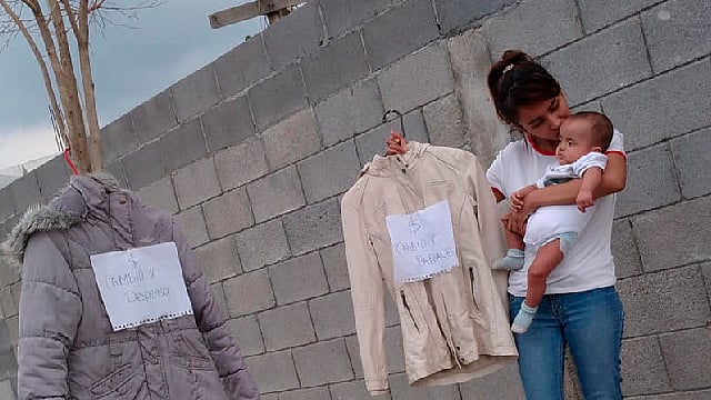 A través de la cuenta de Facebook Color Esperanza Mty, que ayuda a personas necesitadas, se dieron a conocer las fotografías en las que se aprecia a la joven, originaria de Monterrey, cargando su bebé mientras exhibe dos chamarras con letreros.