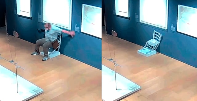 A través de las cámaras de seguridad del recinto, se registró que una pareja ingresó a la galería donde se exhibía la obra. Primero, la mujer simuló sentarse mientras su acompañante le tomaba una fotografía, y luego él se sentó de verdad, provocando el colapso inmediato de la estructura, que no estaba diseñada para ser utilizada como asiento.