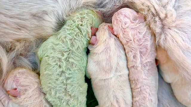De acuerdo con expertos, se cree que ocurre cuando los perritos de color claro tienen contacto en el útero de su madre con un pigmento verde llamado biliverdina. Es el mismo pigmento que causa el color verde en los moretones.