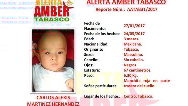 La alerta está registrada con el reporte número AATAB31/2017 y en el resumen de los hechos se apunta que el día 24 de mayo de 2017, a las 17:30 horas, el menor Carlos Alexis "fue sustraído de su domicilio por la ciudadana Marbeli Alvarado López (empleada doméstica), y desde ese momento se desconoce de su paradero".