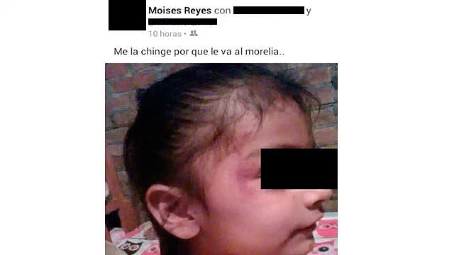 Morelia, Michoacán (MiMorelia.com).- A través de las redes sociales ha comenzado a circular una fotografía de una menor que presenta al menos un golpe en el ojo, el cual le habría propinado su padre, quien publicó en su cuenta de Facebook, lo hizo "por irle al Morelia".