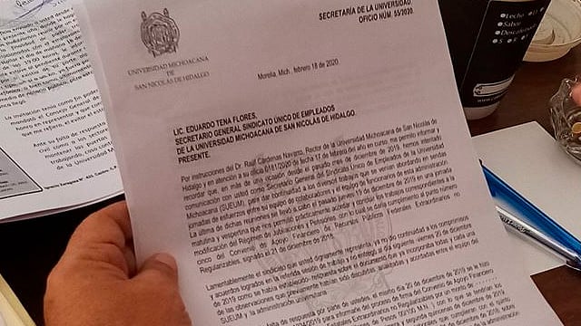 "Informo a usted (Silvia Hernández Capi, secretaria Administrativa de la UMSNH) que el listado del padrón de socios de nuestra organización sindical que se le entregó fue actualizado por parte de la Junta Local de Conciliación y Arbitraje (JLCA) como Autoridad Laboral", dice el texto.