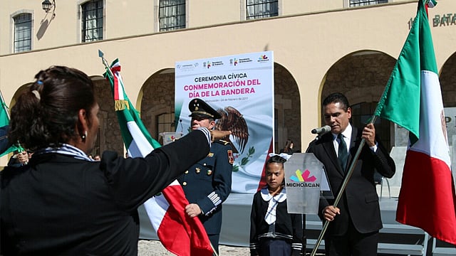Durante su discurso ante militares, funcionarios y escoltas escolares, el mandatario michoacano aseguró que en momentos difíciles la bandera nacional ha sido símbolo de unidad para los mexicanos, y actualmente debe llamar combatir la marginación y la desigualdad.