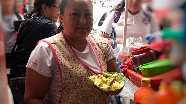 El Ayuntamiento de Pátzcuaro compartió en sus redes sociales una imagen en la que se ve a una comerciante que sirvió el producto que vende en una hoja de repollo.