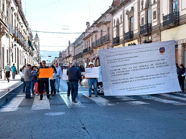 Morelia, Michoacán (MiMorelia.com/Redacción).- Integrantes del Sindicato de Profesores de la Universidad Michoacana (SPUM) se manifestaron este viernes por la mañana en los accesos al Congreso del Estado para demandar de la autoridad los pagos pendientes.