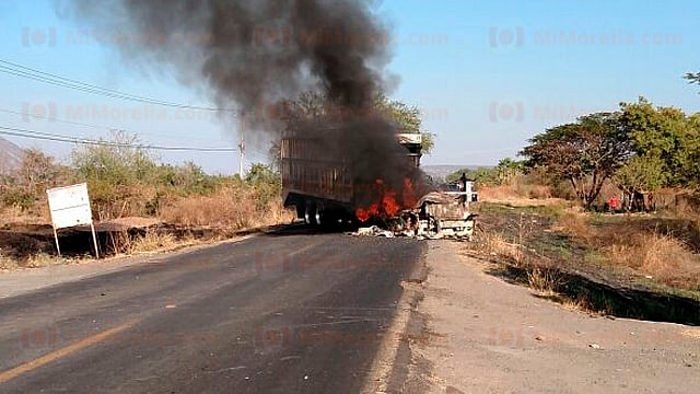 La tarde de este martes sujetos desconocidos y fuertemente armados se apoderaron de vehículos de carga y unidades particulares para atravesarlas y quemarlas en la carretera Apatzingán-Aguililla.