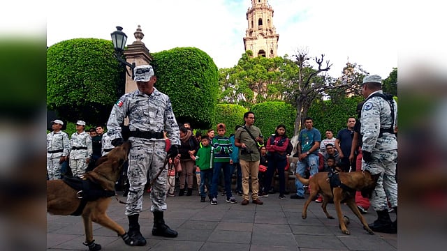 Morelia, Michoacán (MiMorelia.com).- En la Plaza de Armas de Morelia, personal de la Guardia Nacional realizó una exhibición canófila.